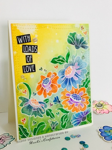 I have used my designed stamp 'Wild Florals' and sentiment is from 'Love' stamp set. White embossed the flowers and coloring done using Zig markers.