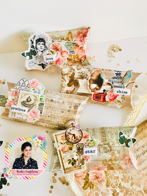 I’ve created a treasure box in vintage look. Used newly launched Dress My Craft Timeless Beauty paper collection. It’s a perfect collection for your Mixed Media and vintage projects. All the papers are so versatile and the colour blends are gorgeous! The printed texture and beautifully placed flowers enhance the beauty of this paper pack. Used some Transfer Me prints and Motif sheets elements for decorating my box. Used previously launched dies and sequins too. All supplies are listed at the end of the post. Created some pillow boxes for inside treat.